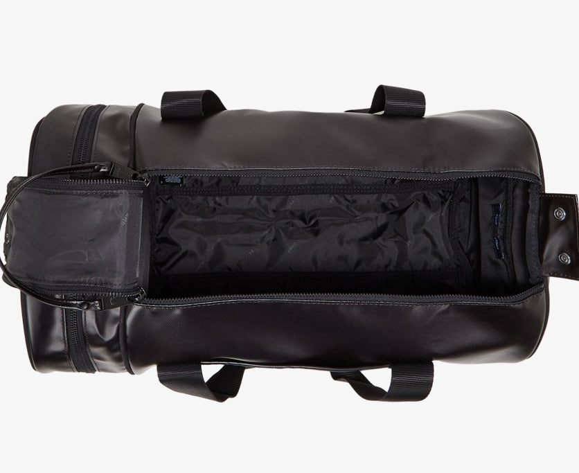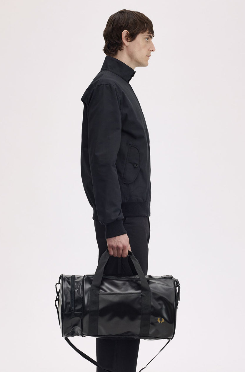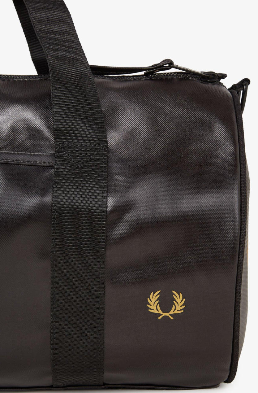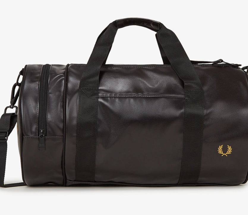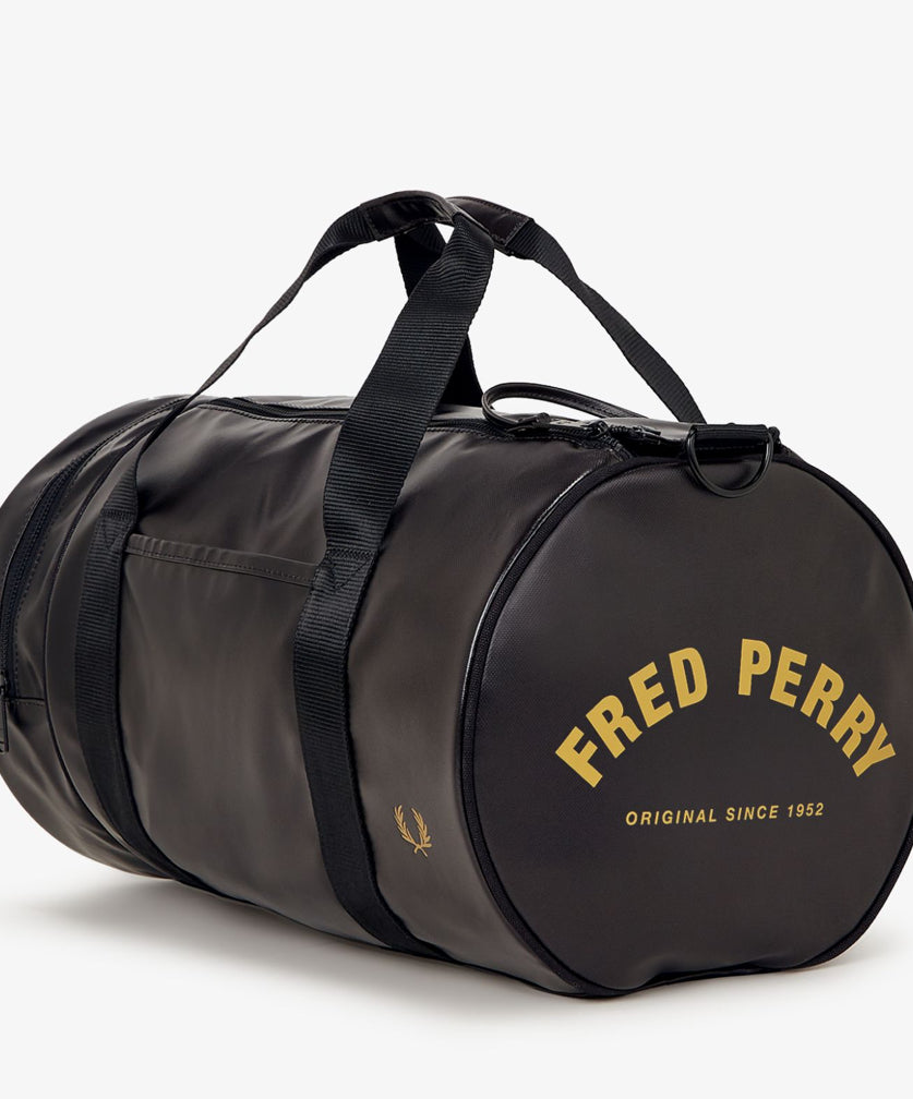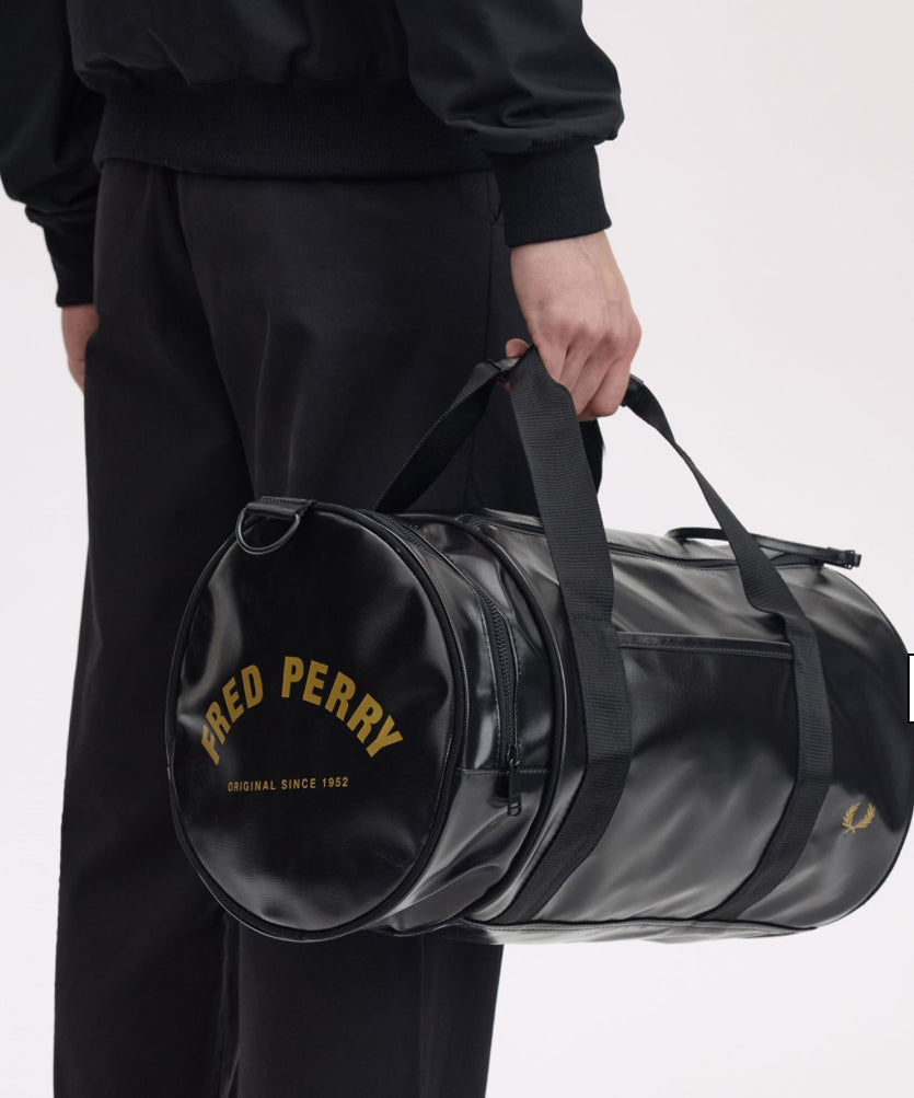 Progettato per resistere agli agenti atmosferici nel corso degli anni, conserva tutte le classiche caratteristiche sportive: doppia apertura superiore con zip e una tasca arrotondata all'estremità; tracolle regolabili in gros-grain e due manici principali; logo stampato color oro su entrambe le estremità; e logo con corona d'alloro in lamina dorata in rilievo sul pannello frontale, per uno stile inconfondibilmente Fred Perry.
