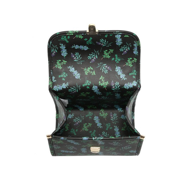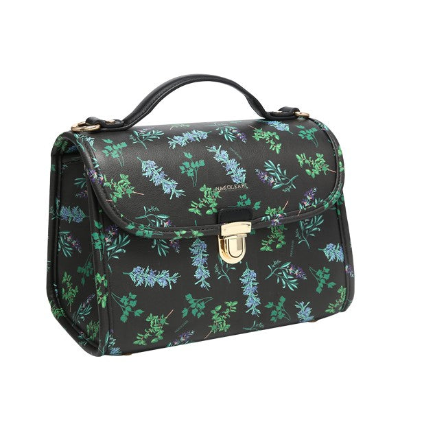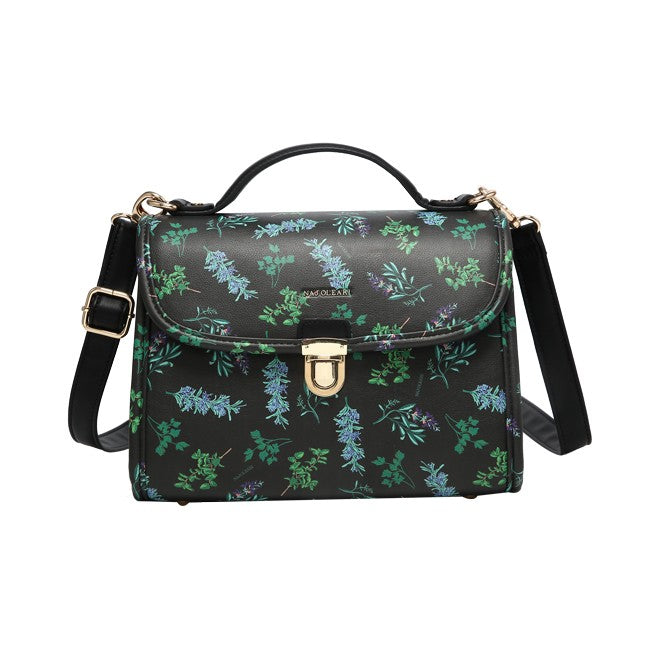 Cestino Naj-Oleari con stampa floreale, manico corto per uso a mano e tracolla con decorazione stampata floreale, regolabile . Sul fronte chiusura a patta.