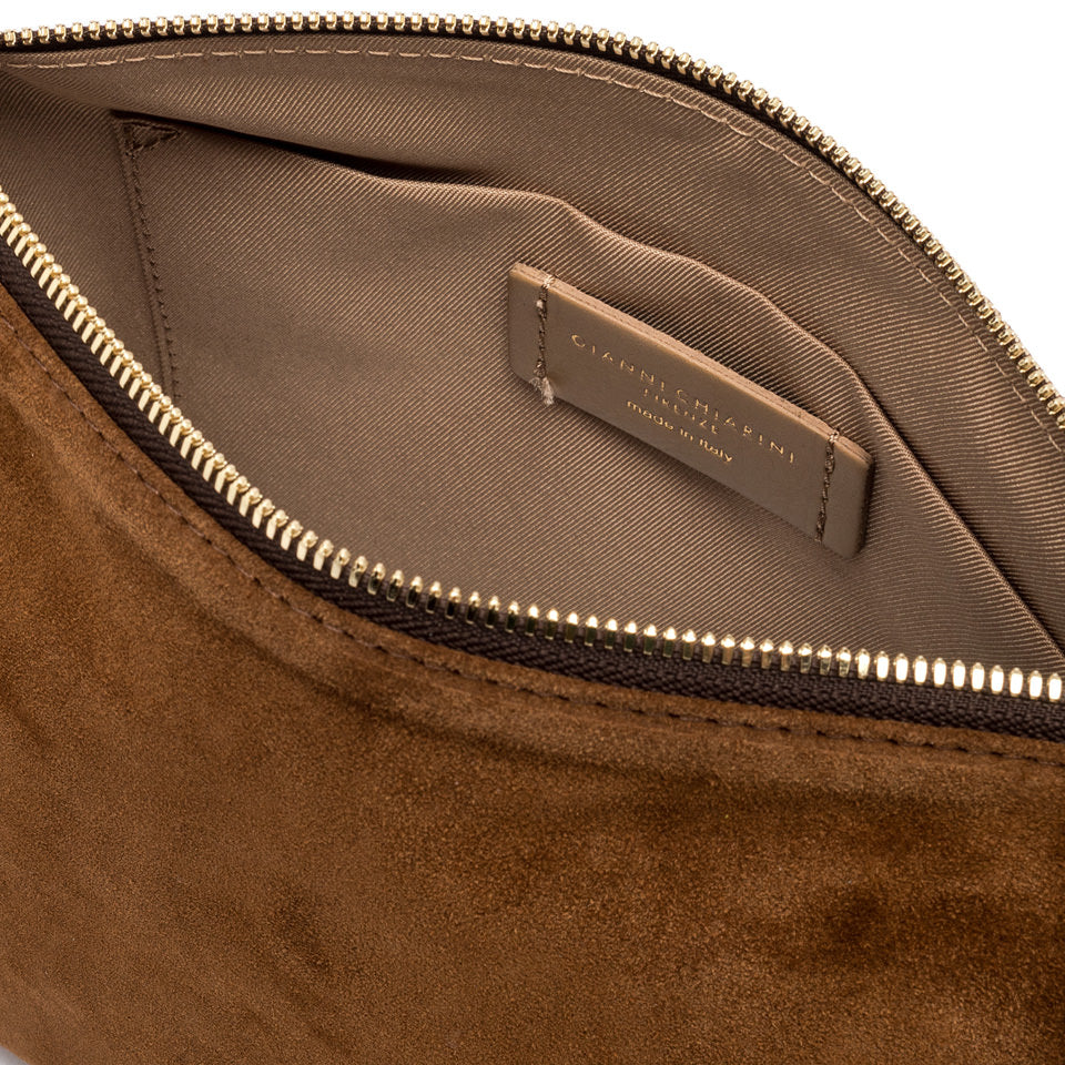 La borsa Nora Pouch by Gianni Chiarini Firenze è realizzata in morbida pelle scamosciata. È dotata di un cinturino in pelle che permette di portarla al polso e di una tracolla regolabile, entrambi removibili. Presenta una chiusura con zip per una maggiore praticità. Dimensioni: 28x21x9 cm.