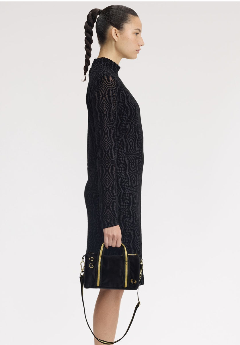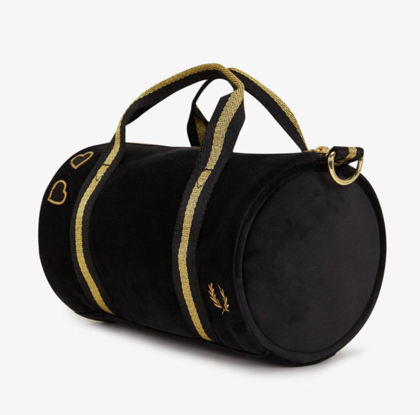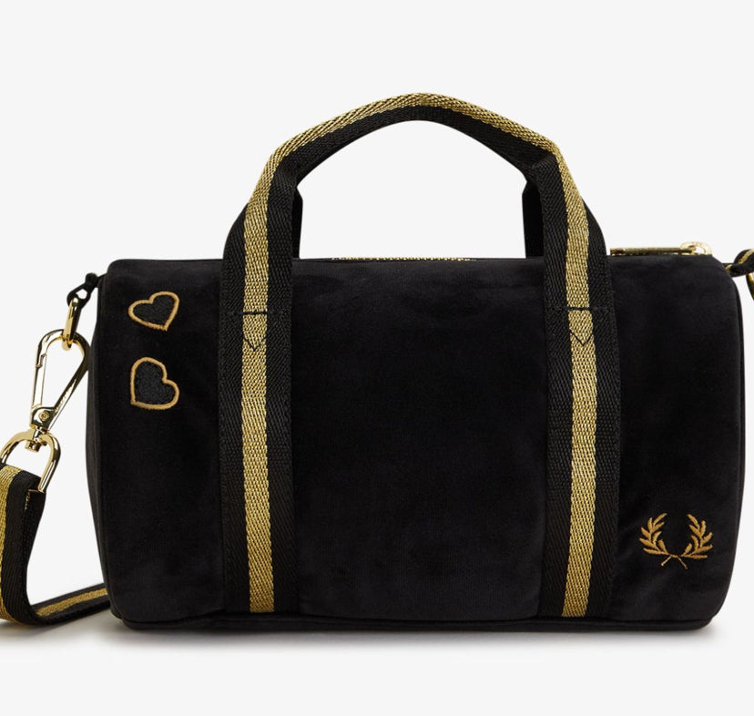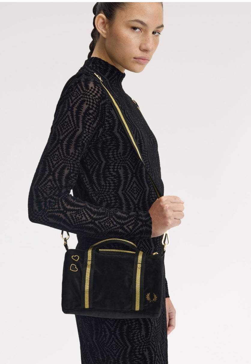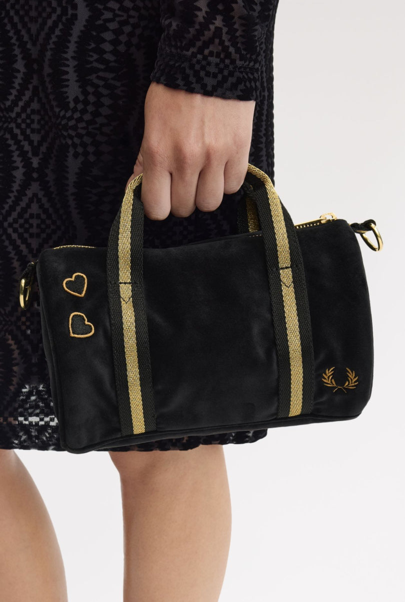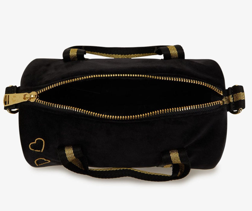 Una mini borsa che abbina il velour nero alla riga dorata, rifinita con i cuori ricamati di Amy.