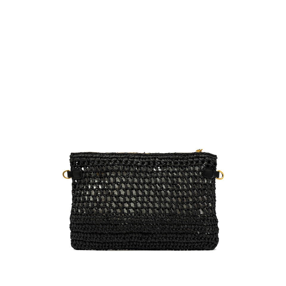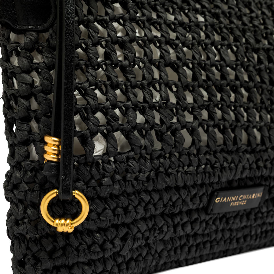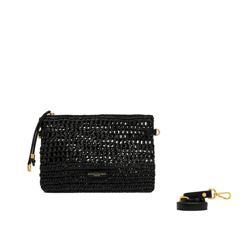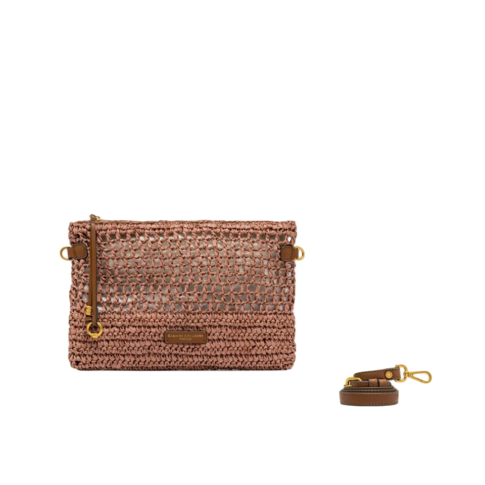 Nefeli è la nuova pouch di Gianni Chiarini Firenze dalla silhouette rettangolare, realizzata in paglia crochet, perfetta per affrontare con leggerezza e stile le giornate estive. Presenta una chiusura con zip e dettagli in metallo che donano un tocco luminoso al design. Dotata di tracolla pratica e removibile per un utilizzo versatile. Dimensioni: 28x18x2 cm.