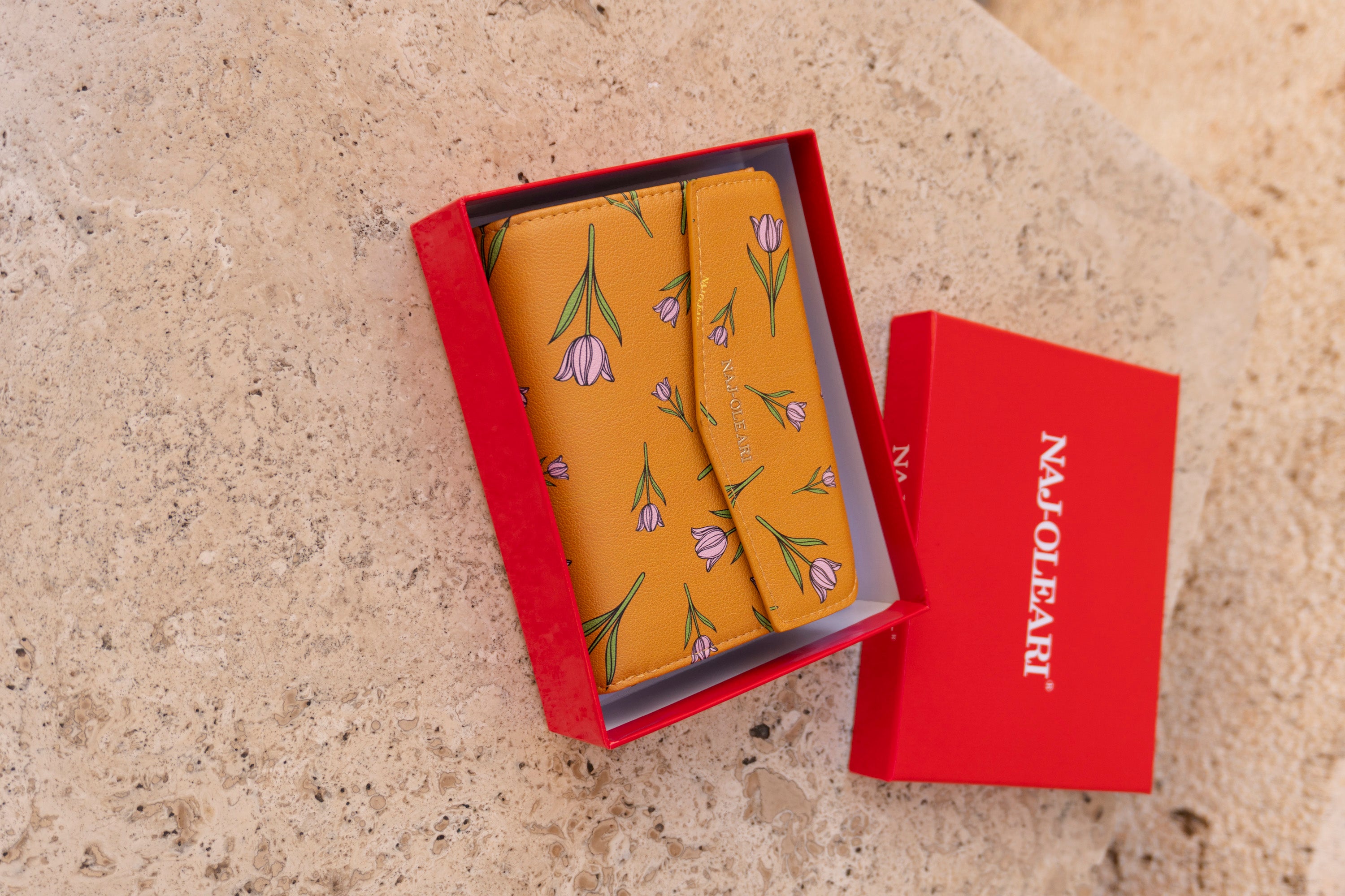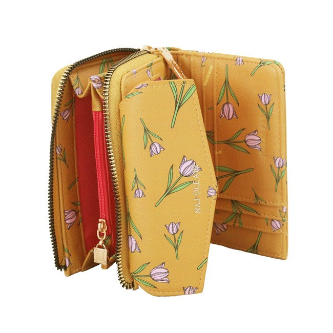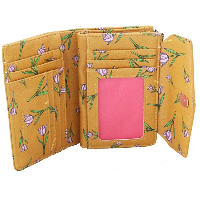 Portafogli donna con patta e portamonete con stampa tulipani composta da piccoli fiori nei toni ocra.