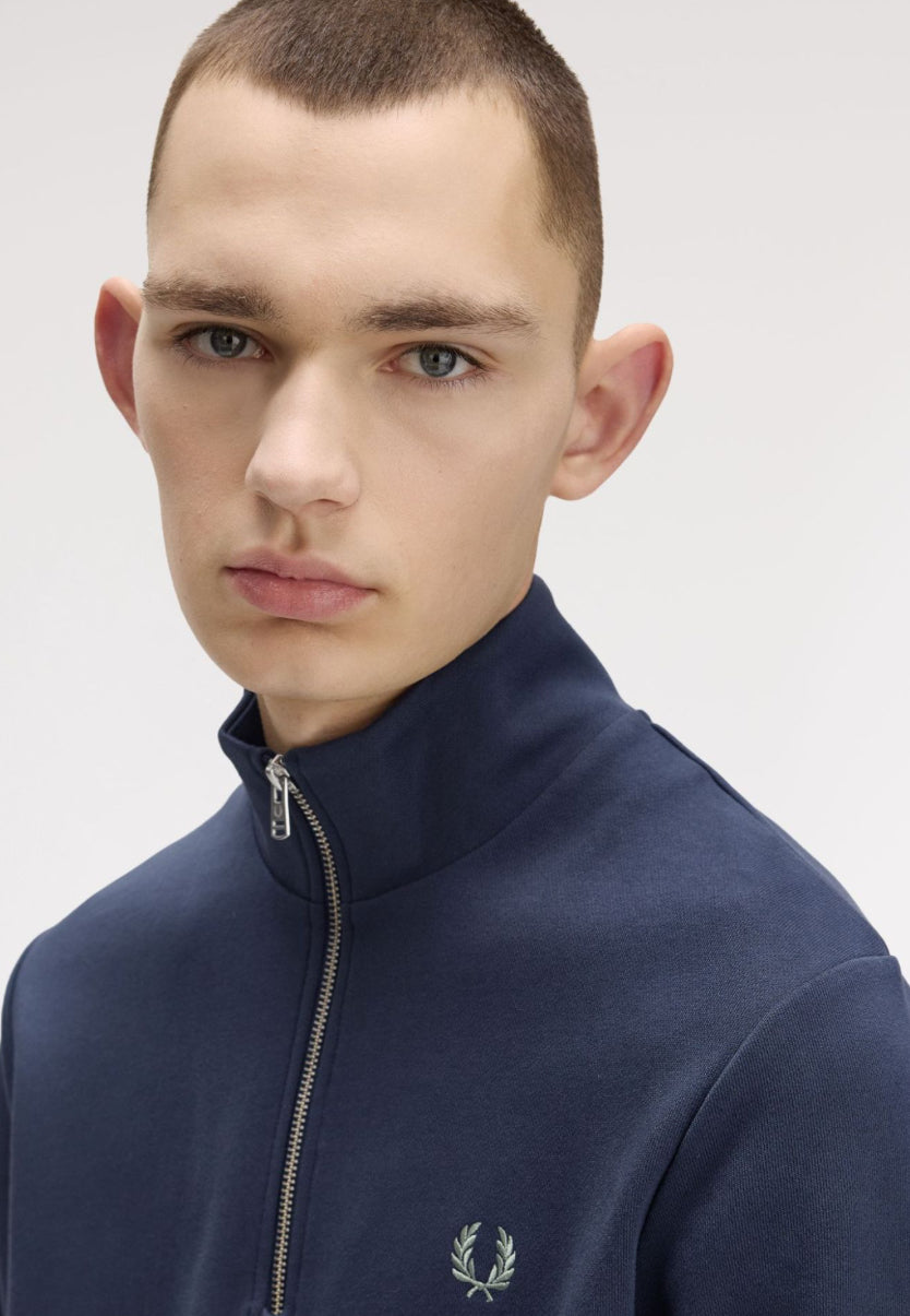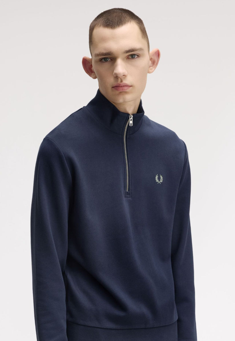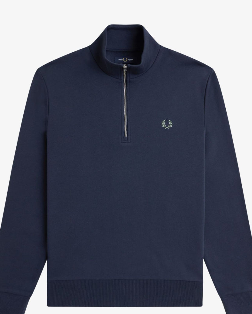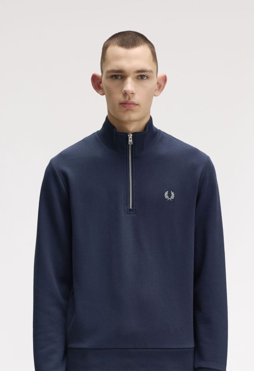 La nostra felpa in cotone con mezza zip e doppia riga sui polsini.