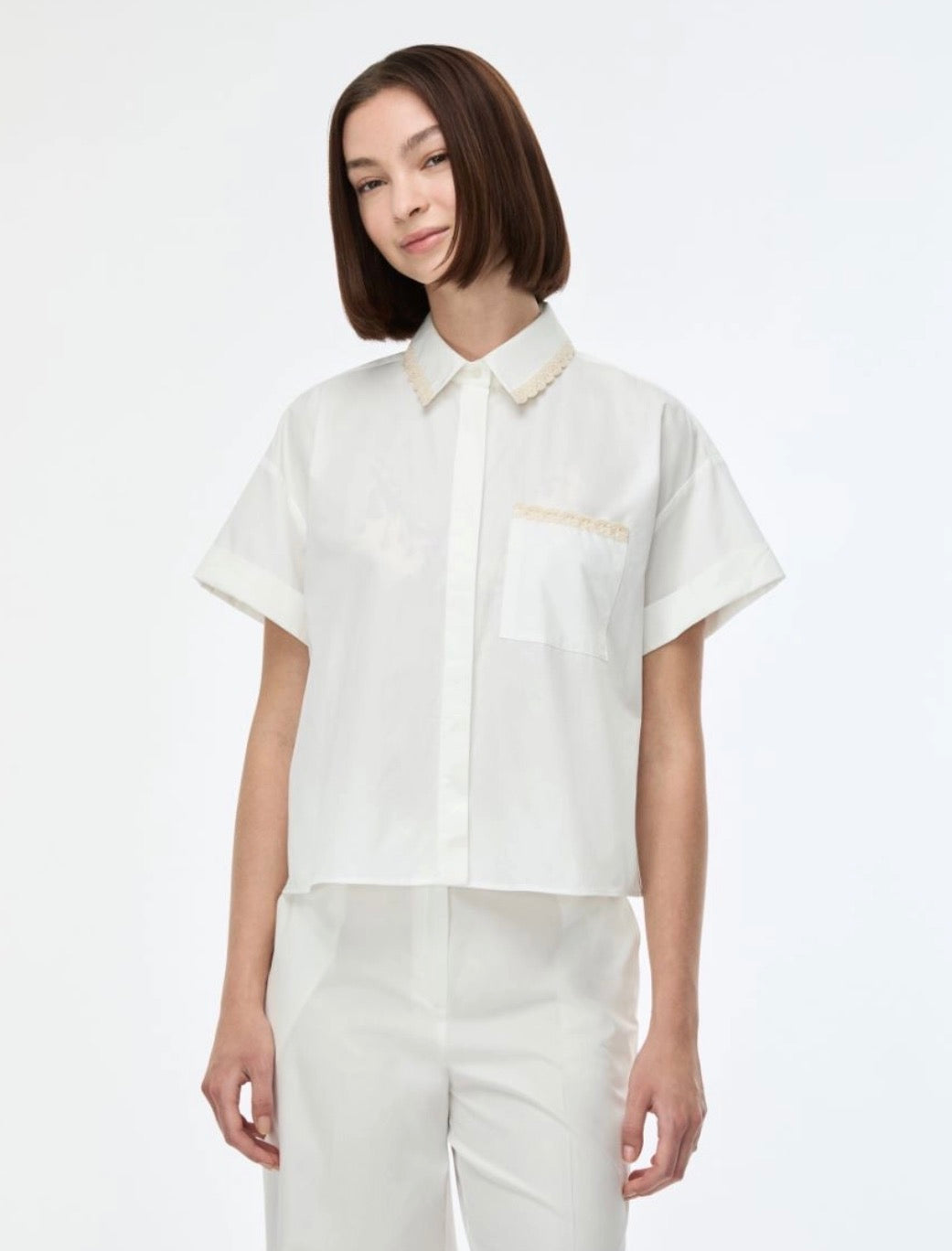 - Colletto, maniche corte con risvolto