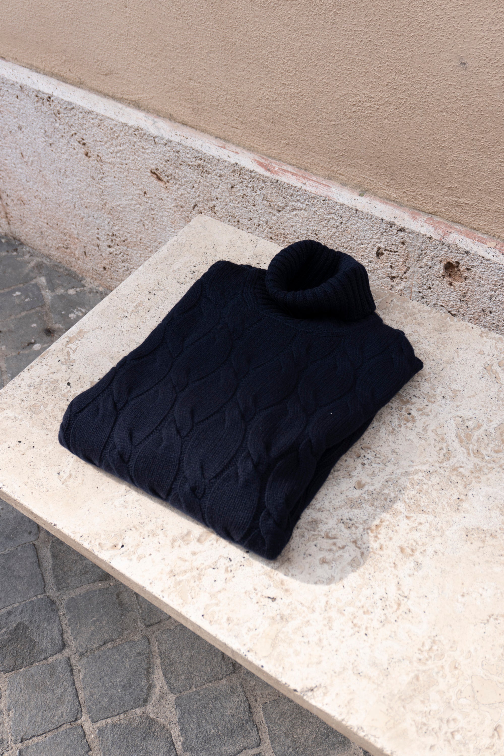 - Maglia dolcevita in lana con lavorazione interna a trecce.