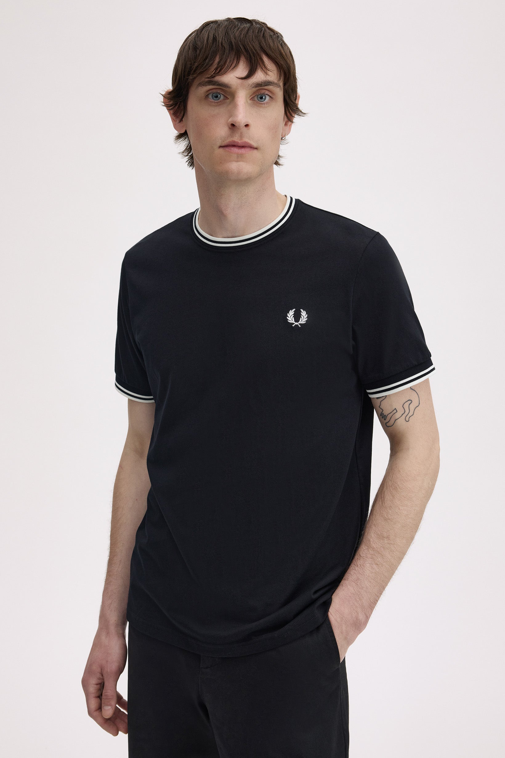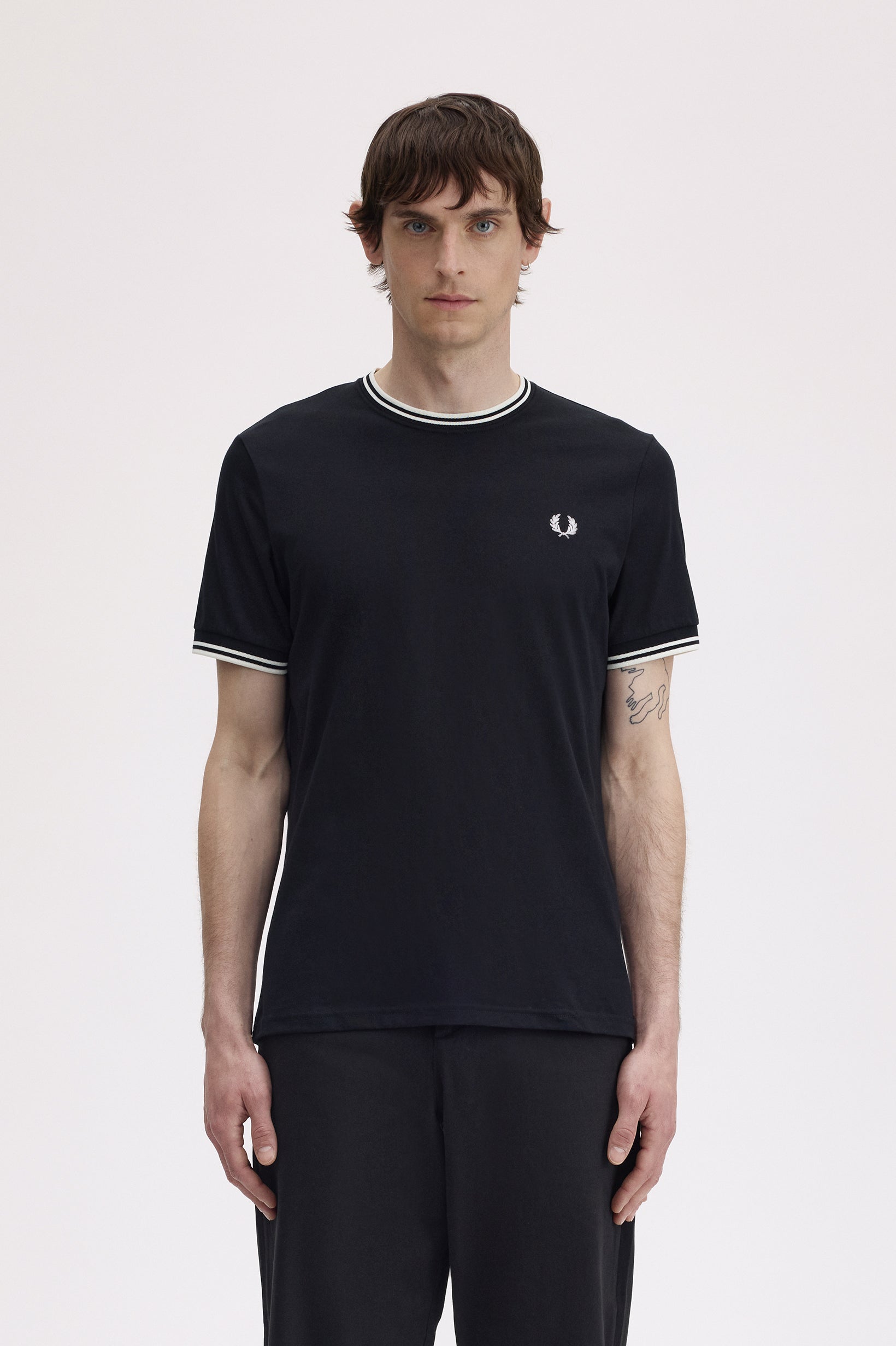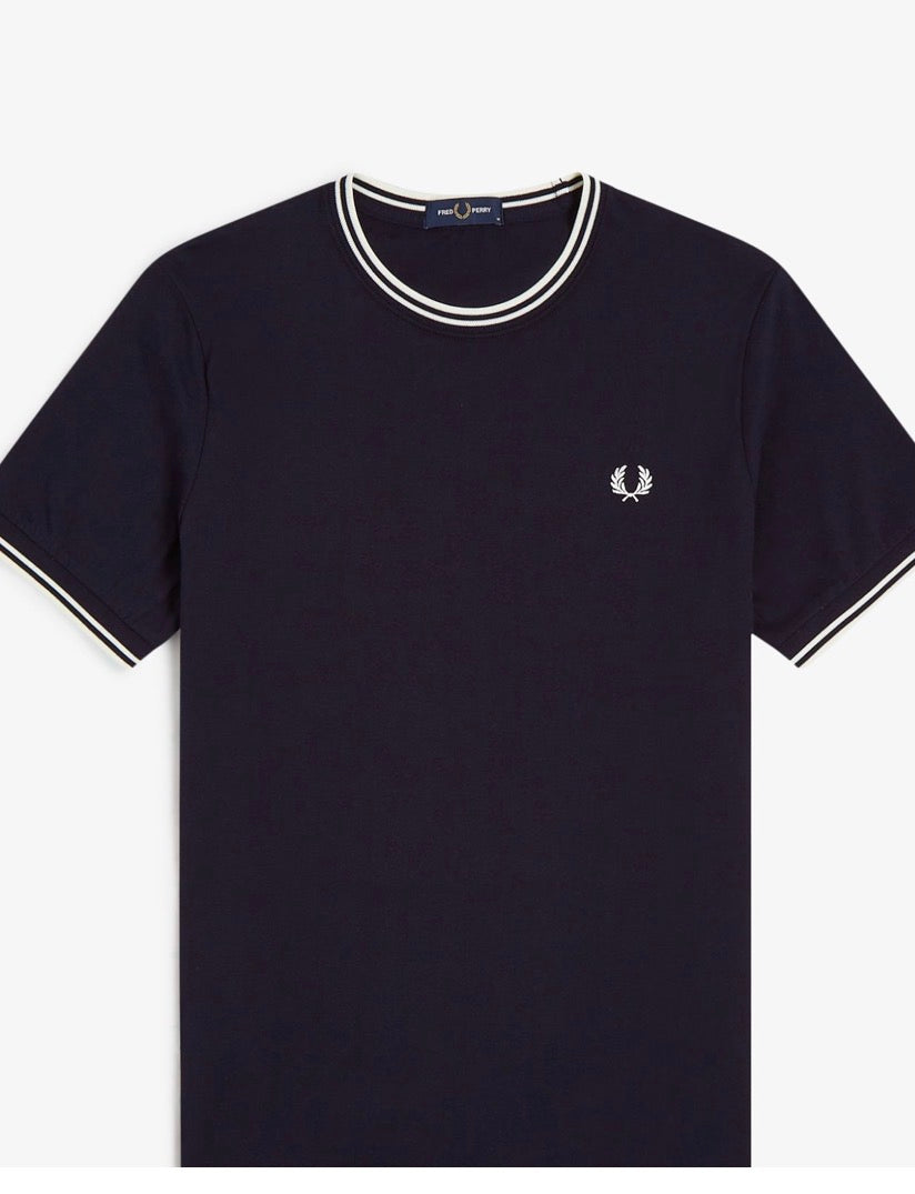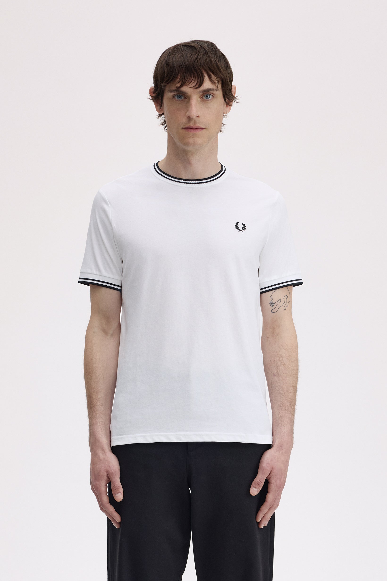La leggenda narra che la nostra doppia riga sia nata quando un cliente del negozio londinese Lillywhites chiese che venissero aggiunti i colori della sua squadra di calcio alla polo da tennis tinta unita di Fred. Solo noi utilizziamo la riga con rapporto 5-4-4 ed è parte del nostro DNA. Con i nostri caratteristici dettagli, la nostra T-shirt girocollo sfoggia la doppia riga e la corona d'alloro ricamata in colore coordinato. Un classico Fred Perry.