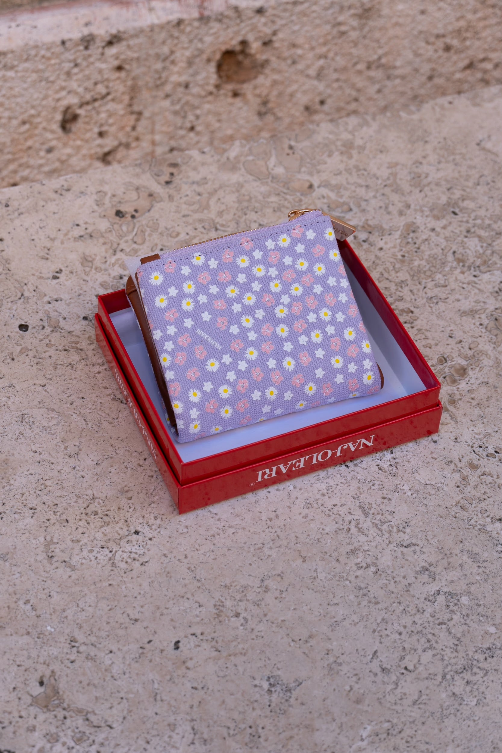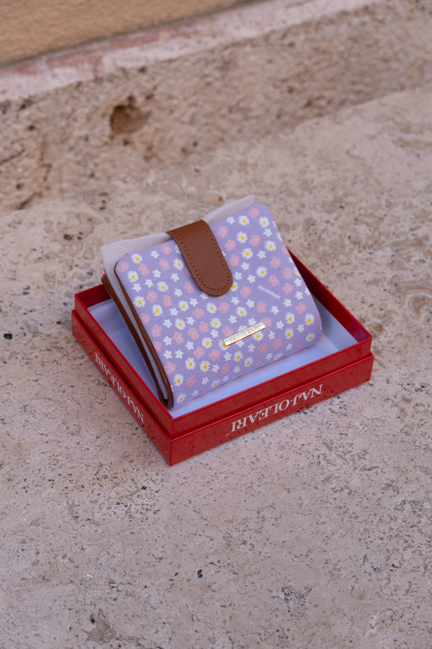 Portafoglio color glicine con fiori. Chiusura con bottone. All'interno scompartimento per banconote, e tessere,tessuto morbido