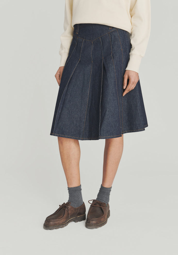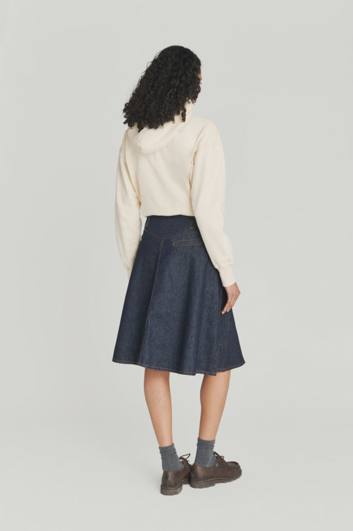 - Gonna Sally in denim rinse con lavaggio scuro e impunture in contrasto.