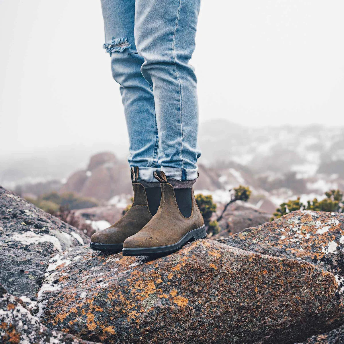 Gli stivaletti modello Blundstone #1615 sono realizzati con tomaia liscia in pelle scamosciata resistente all'acqua, in un caldo e fashion colore verde oliva scuro. Design ispirato ai Chelsea boots con classici elastici laterali, si elevano su di una comoda suola in gomma antiscivolo con carrarmato. Dotati di linguetta frontale e posteriore per facilitare la calzata, sono scarpe comode e alla moda della serie Originals, per look casual chic.