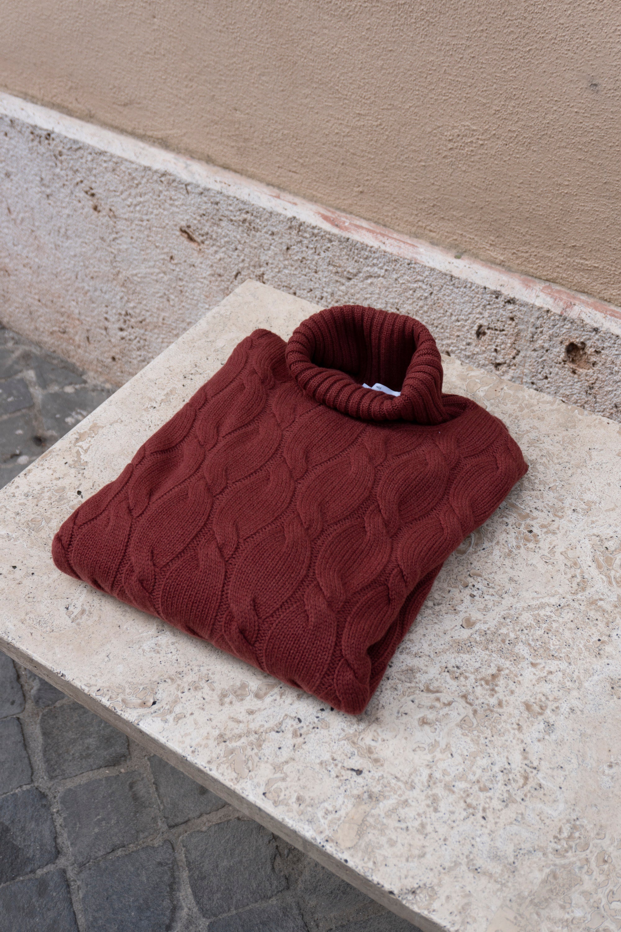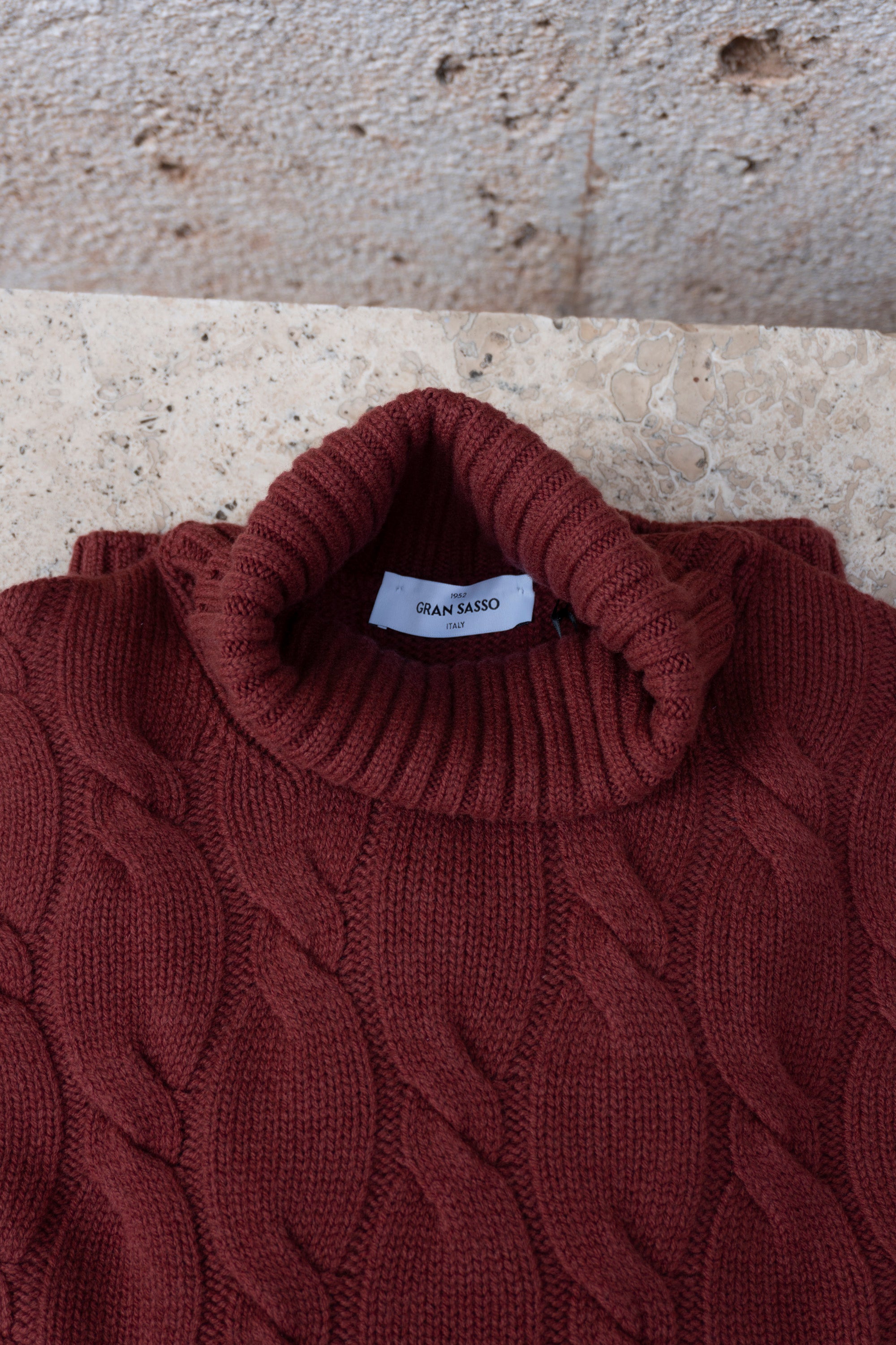 - Maglia dolcevita in lana con lavorazione interna a trecce.