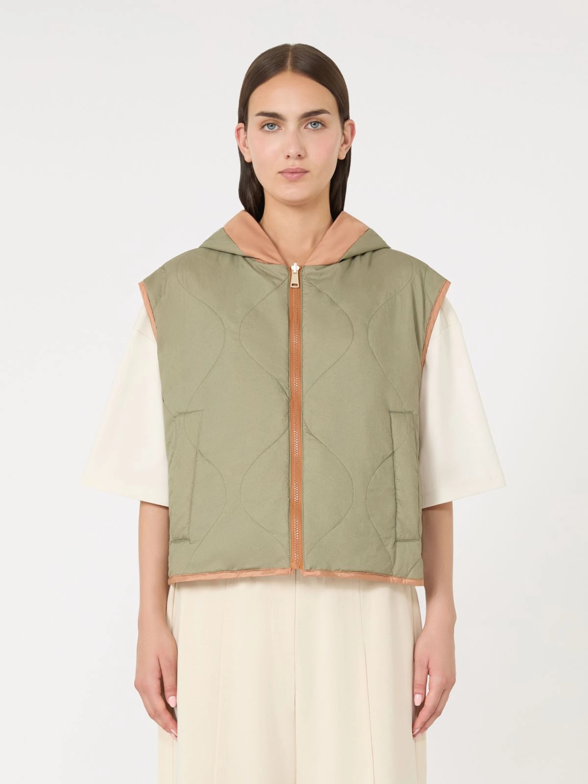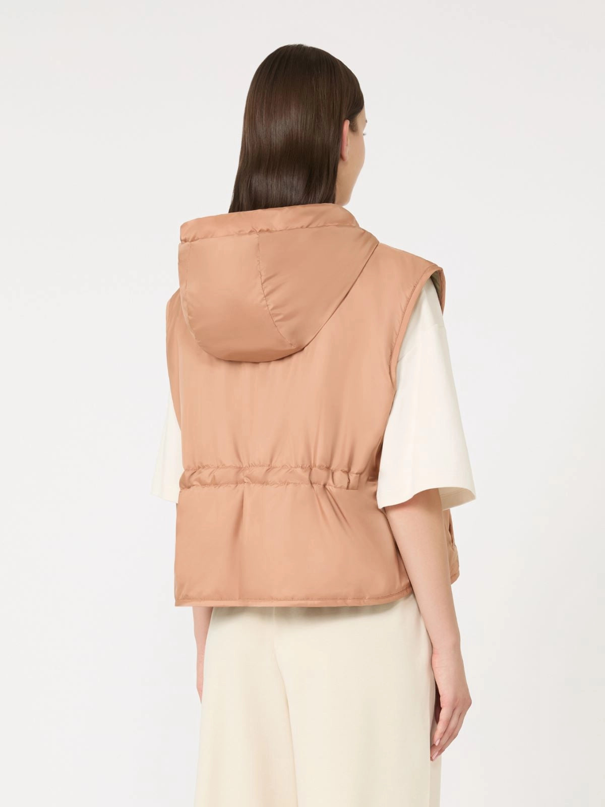 Gilet corto con cappuccio a coulisse, imbottito in Luxepad Ultra Fine Insulating Technology Camel-Silk Blend Edition.